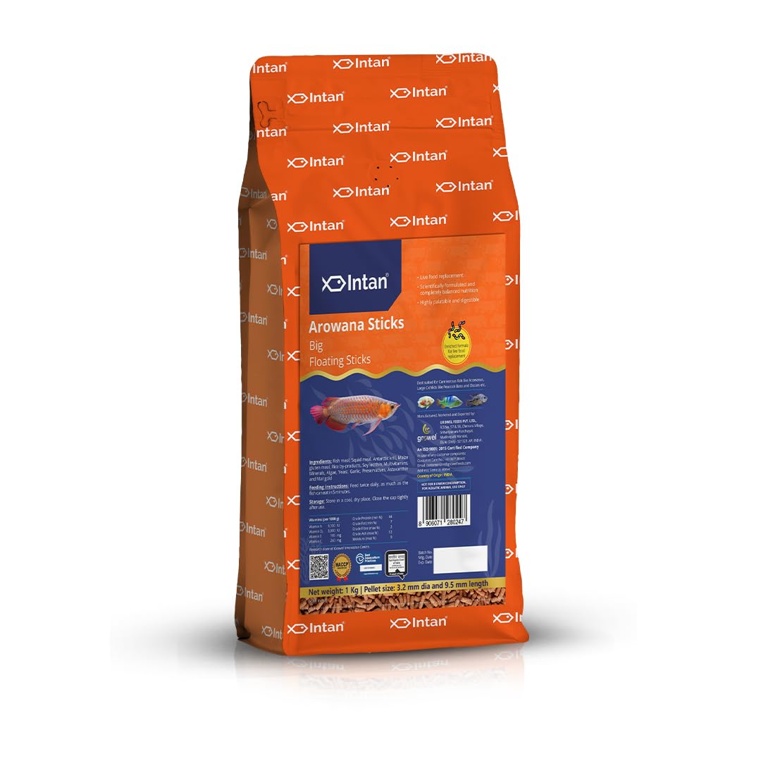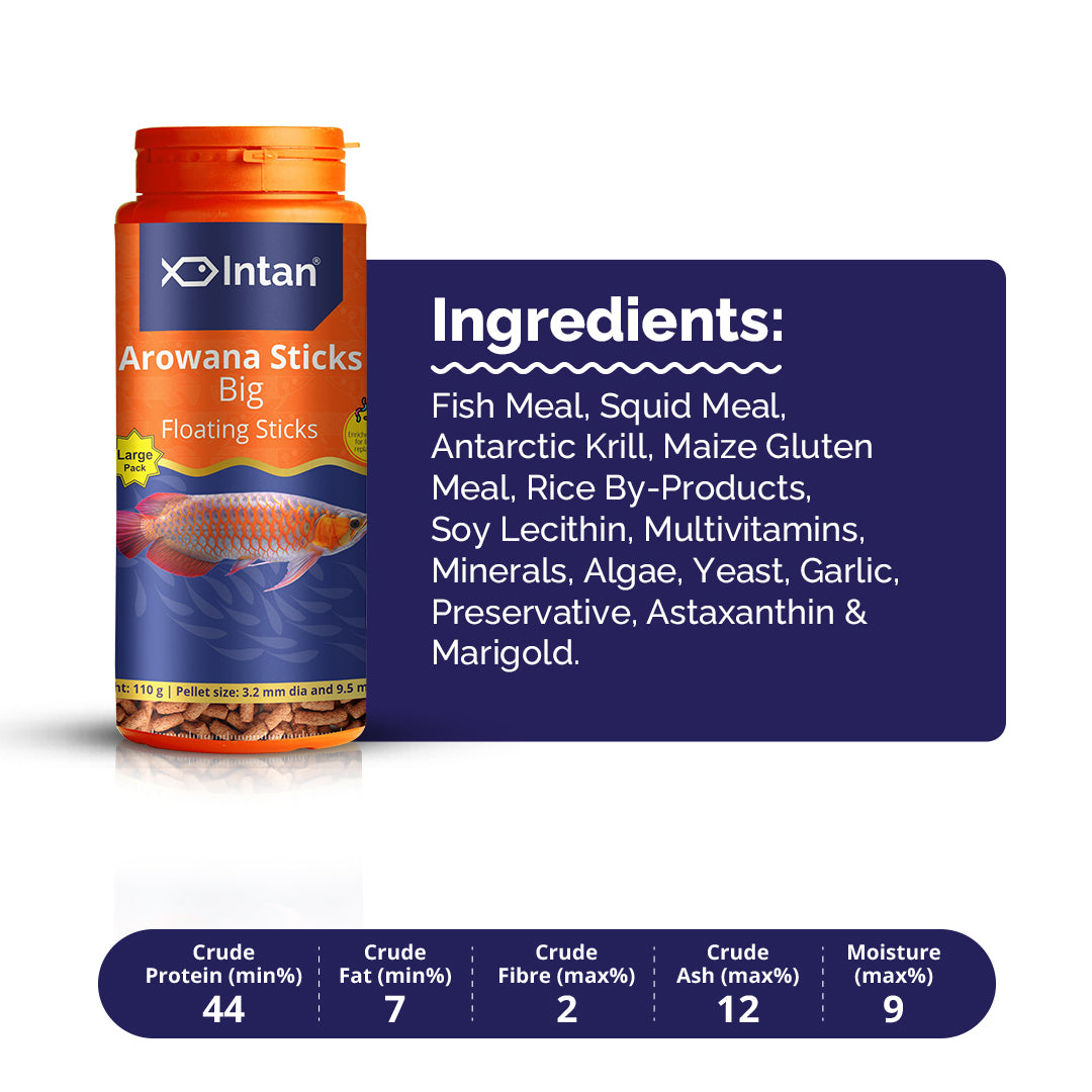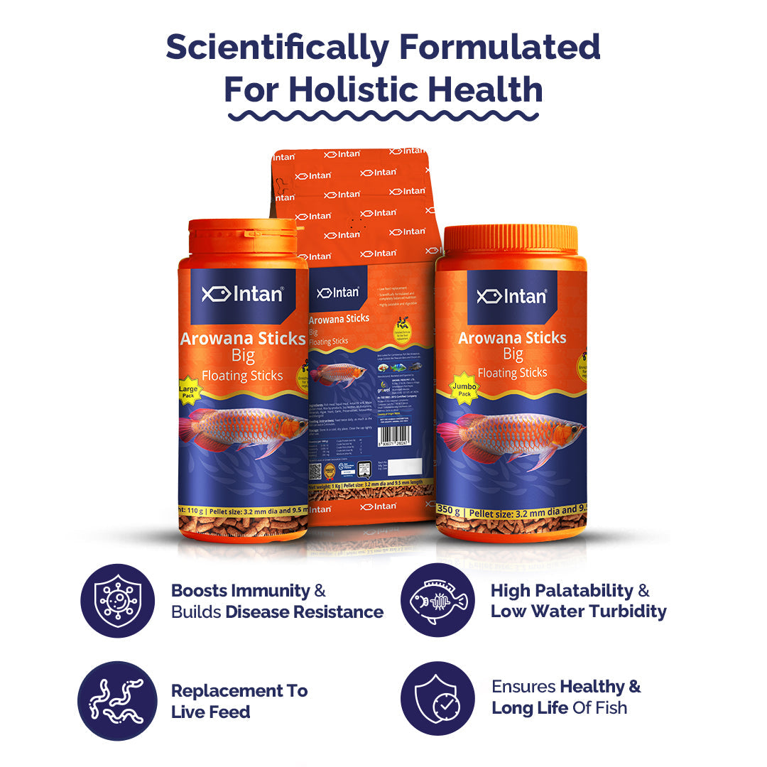Intan Arowana Sticks (Big Floating Sticks), a Highly Nutritious Ornamental Fish Food with 44% protein, are a nutrition-packed, customized feed ideal for fish like Arowanas, & large Cichlids such as Peacock Bass & Oscars. Enriched with natural attractants & Astaxanthin, this feed not only develops & highlights the fish's natural colours but also increases their longevity.