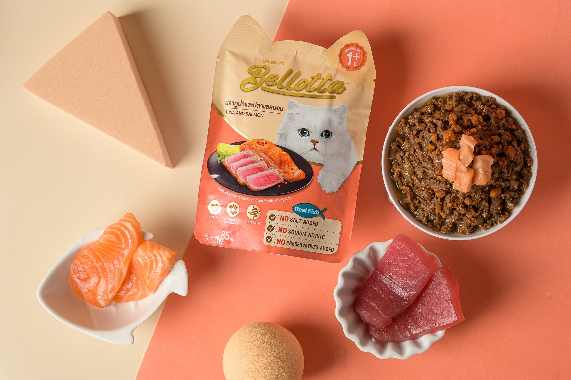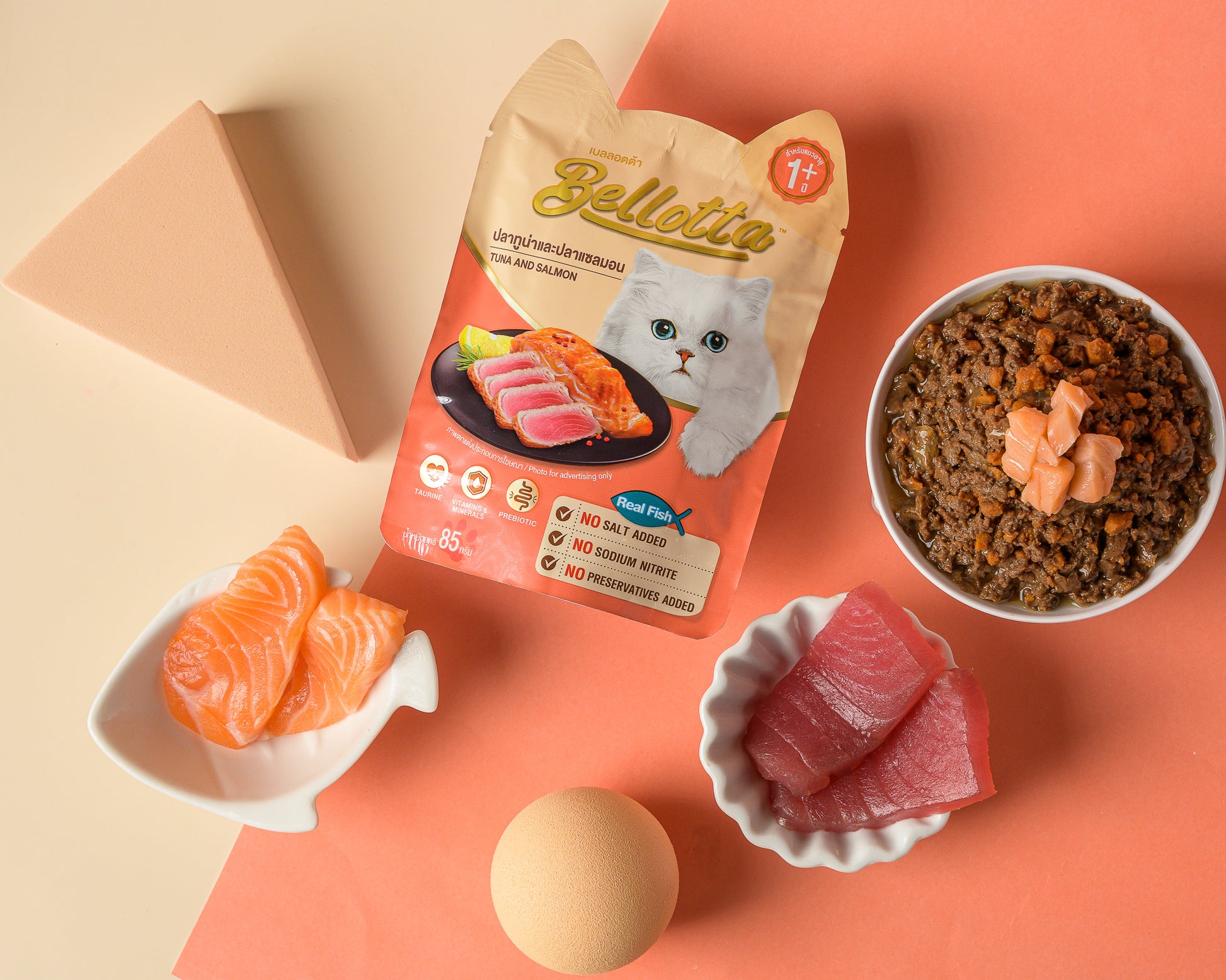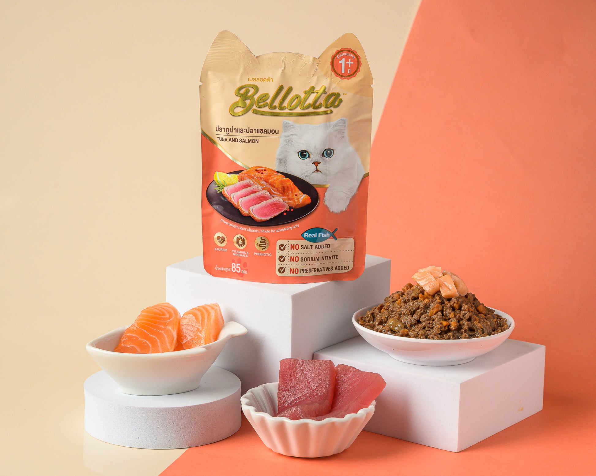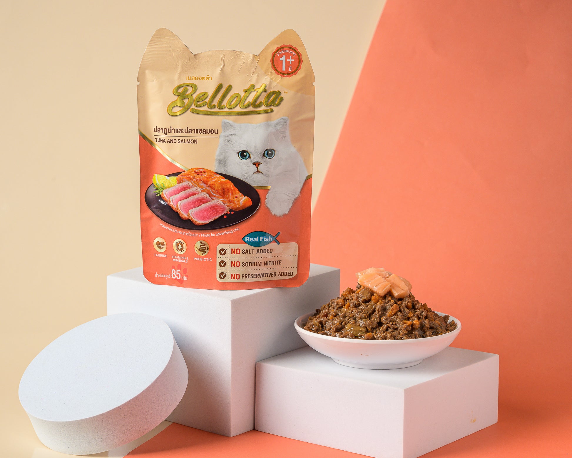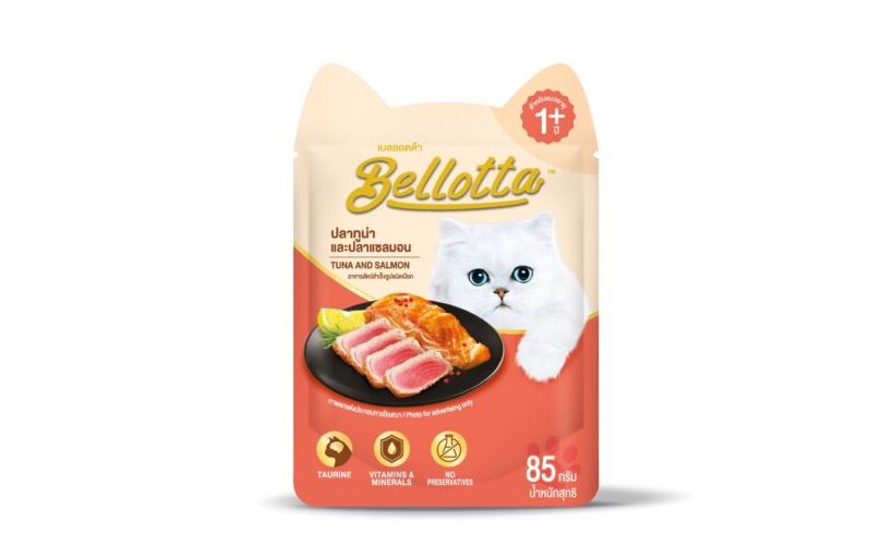 An 85g pouch of wet cat food featuring tuna and salmon flavors. Contains taurine and essential vitamins for your cat's growth.
