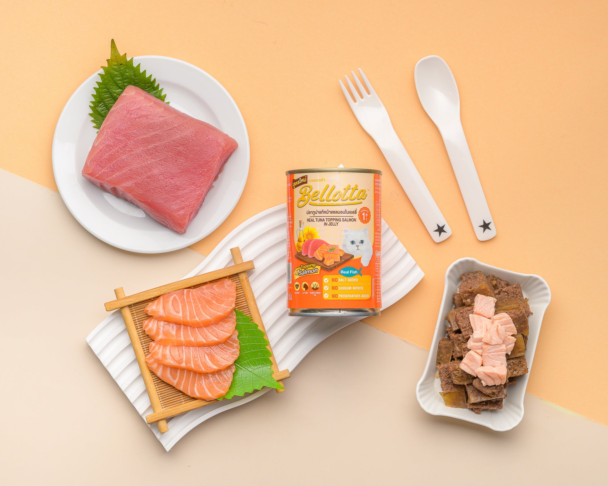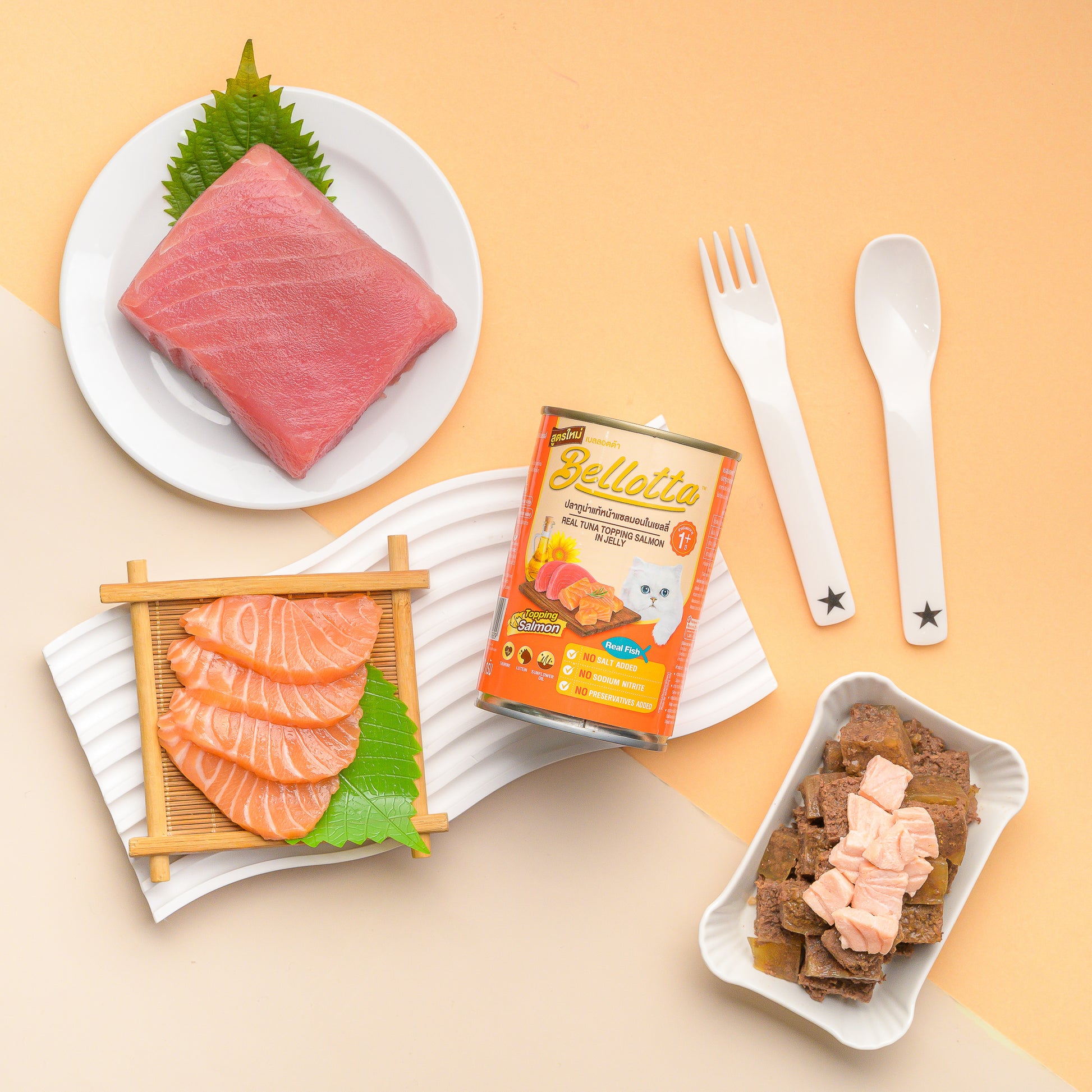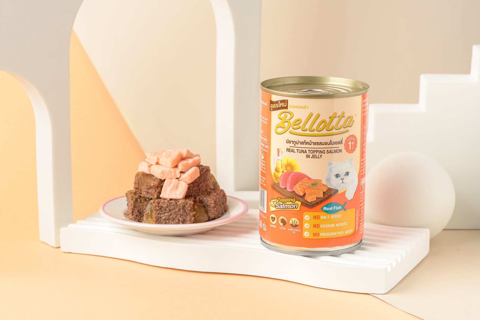 Bellotta 400g Can Real Tuna Topping Salmon in Jelly is a flavorful cat food made with high-quality tuna and salmon, served in a tasty jelly. Rich in protein and omega-3 fatty acids, it supports healthy skin, coat, and overall vitality. Perfect as a complete meal or a topper for dry food.