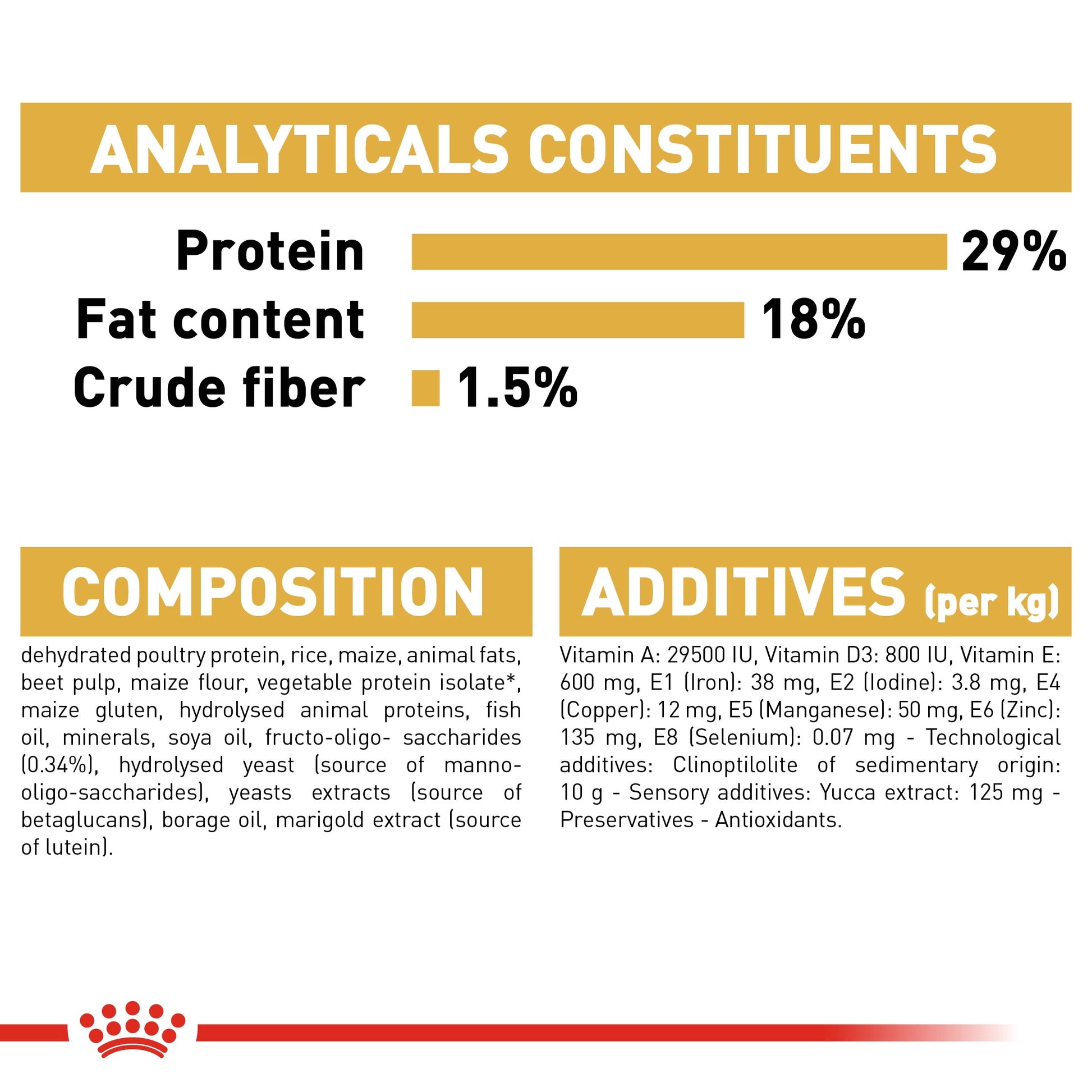 مناسب للكلاب التي يصل عمرها إلى 10 أشهر، تم تصميم ROYAL CANIN® Pug Puppy خصيصًا مع وضع جميع الاحتياجات الغذائية لجروك في الاعتبار. خلال فترة النمو الرئيسية هذه، يتطور الجهاز المناعي لدى الجرو تدريجيًا. يحتوي ROYAL CANIN® Pug Puppy على مجموعة حاصلة على براءة اختراع من مضادات الأكسدة التي تساعد على دعم دفاعاته الطبيعية. تحتوي التركيبة الحصرية لـ ROYAL CANIN® Pug Puppy على مركب محدد وأحماض أوميغا 3 الدهنية EPA وDHA للمساعدة في تغذية ودعم دور حاجز الجلد، وهذا مهم للصيانة المثلى لبشرة جروك الصحية. علاوة على ذلك، تم تركيب ROYAL CANIN® Pug Puppy من العناصر الغذائية المختارة خصيصًا لبروتينها عالي الجودة (LIP) والبريبايوتكس (FOS) لدعم صحة الجهاز الهضمي لكلبك الصغير. تم تصميم الطعام في ROYAL CANIN® Pug Puppy خصيصًا لسلالة Pug. يمكن أن يجعل شكل فك الصلصال وشفتيه السميكتين من الصعب عليه التقاط طعامه. لهذا السبب تم تصميم شكل وحجم الطعام في هذه التركيبة خصيصًا لتسهيل على كلبك التقاطه. يشجع الطعام المعدّل أيضًا الجرو على المضغ جيدًا قبل البلع.