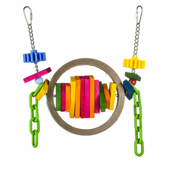 Paper bagels are made of layers upon layers of paper. It’s time consuming to peel off the bagel completely. Yet time is what the parrot has when being left alone in the cage. When feeling bored, parrots like Cockatos, African Greys and Macaws would pluck their feathers until they are completely gone. Providing toys that they can shred and chew helps to keep their clever mind occupied and eliminates negative behaviors. The colored wooden pieces in the bagel also help to keep the bird's beak healthy and trim.