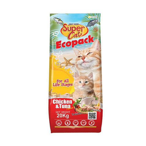 EcoPack Cat Dry Food is a premium quality, economical formula designed for both adult cats and kittens. With a delicious blend of chicken and tuna, it provides complete and balanced nutrition to support overall health, energy, and vitality. Enriched with taurine for heart and eye health, L-lysine to boost immunity and appetite, and Yucca Schidigera extract to help minimize litter box odor.