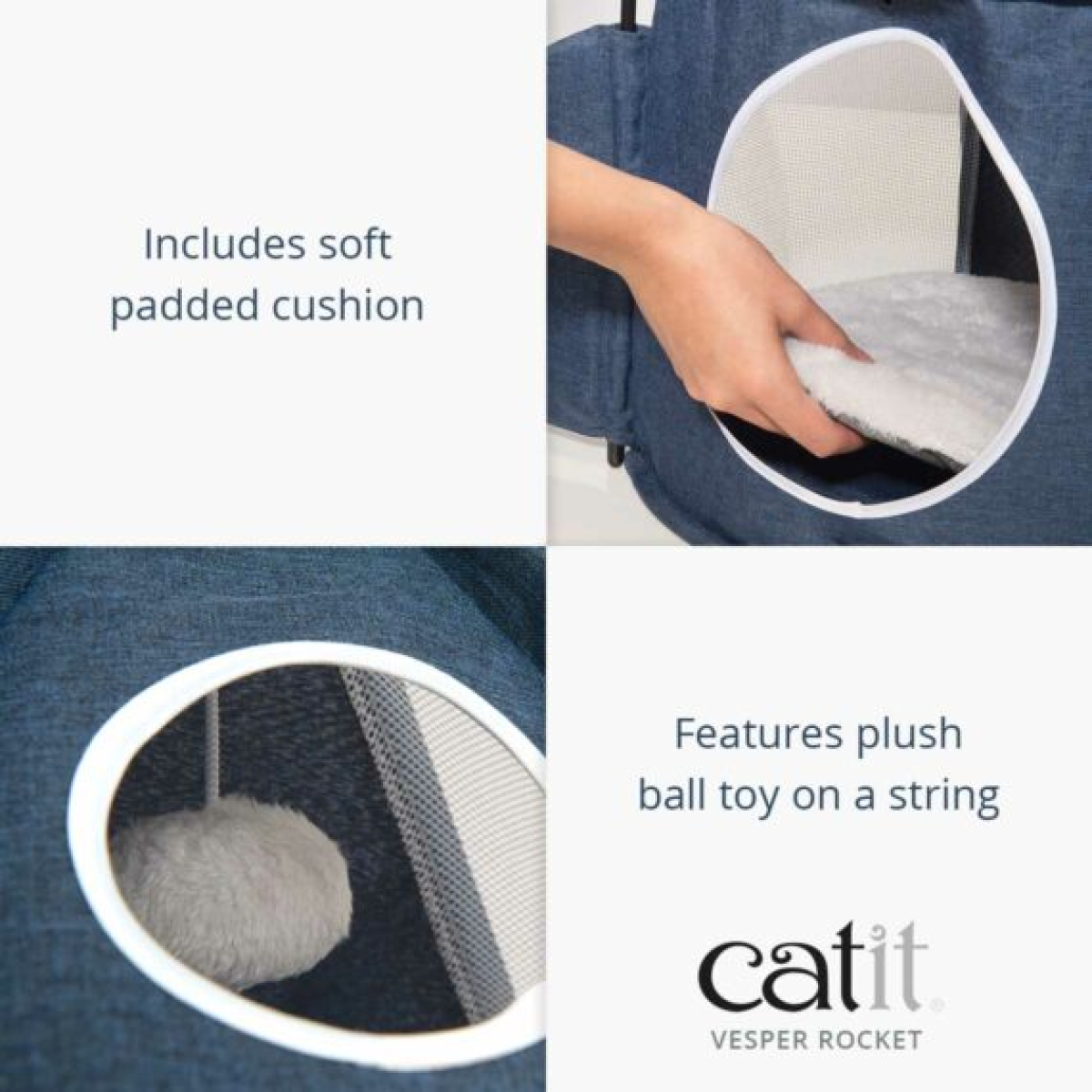 - Includes soft padded cushion and plush ball toy on a string