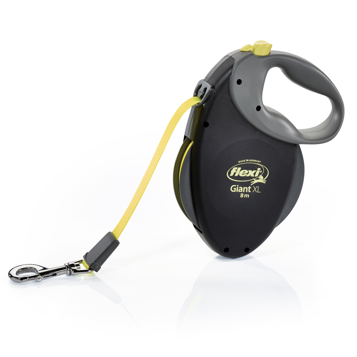 The Flexi Giant Professional Tape 10m is a heavy-duty retractable leash designed for large and strong dogs weighing up to 50 kg. Featuring a robust 10-meter tape, it offers your dog ample freedom during walks while maintaining control. The ergonomic soft-grip handle ensures comfortable use, and the neon-colored tape enhances visibility, even in low-light conditions. Ideal for training sessions and everyday walks, this leash combines durability with functionality.