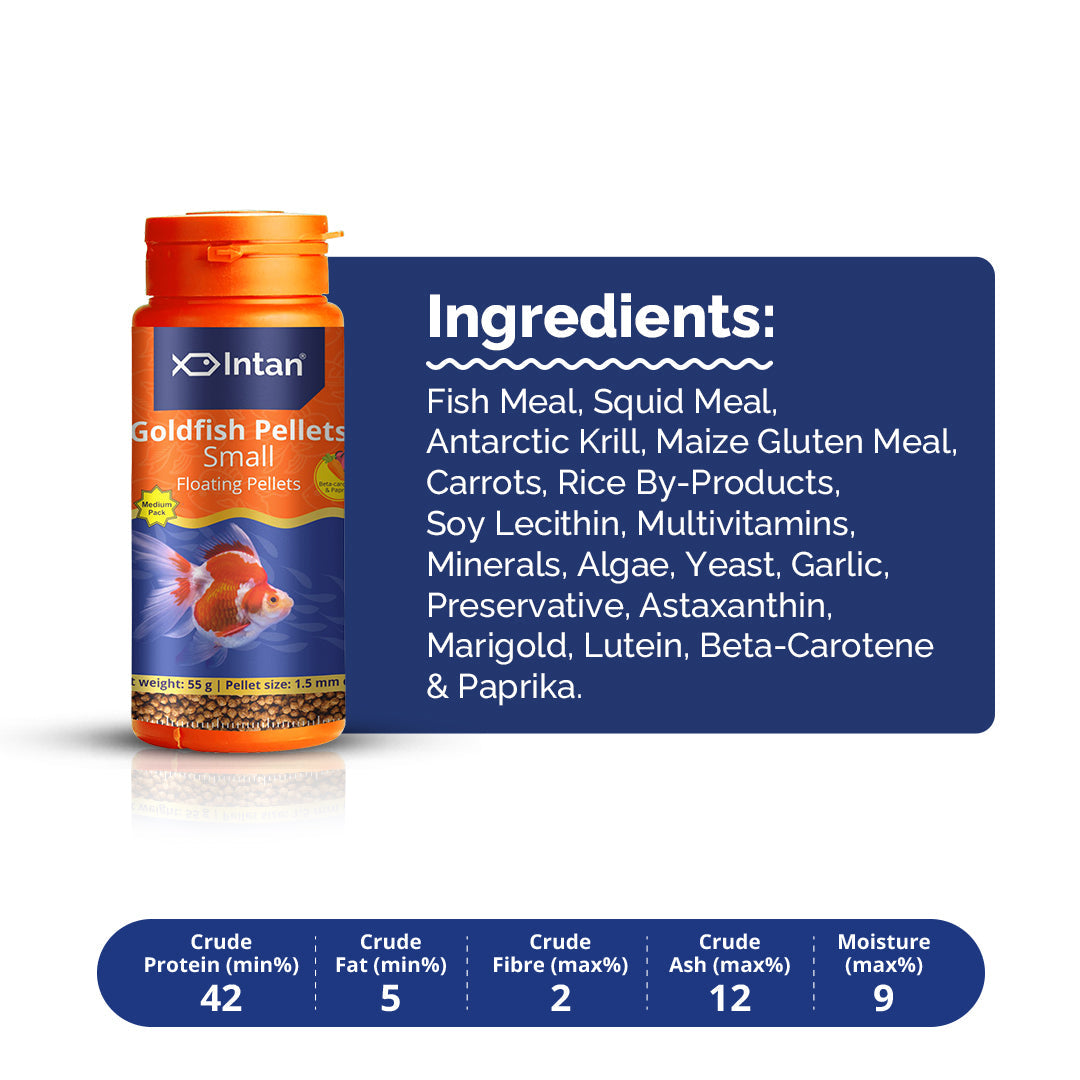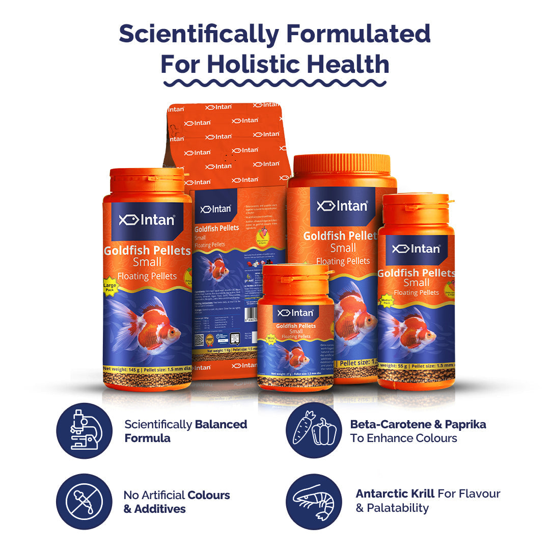 Intan Goldfish Pellets (Small Floating Pellets), a Highly Nutritious Ornamental Fish Food with 42% protein, are specially formulated for all varieties of Goldfish, including Ryukin, Red Cap, Ranchu & Lionhead. These pellets are made with highly nutritious ingredients to ensure maximum intake & nutrient absorption while minimising water pollution. Recognising that Goldfish prefer natural foods like water plants, the formula includes algae & yeast as suitable alternatives.