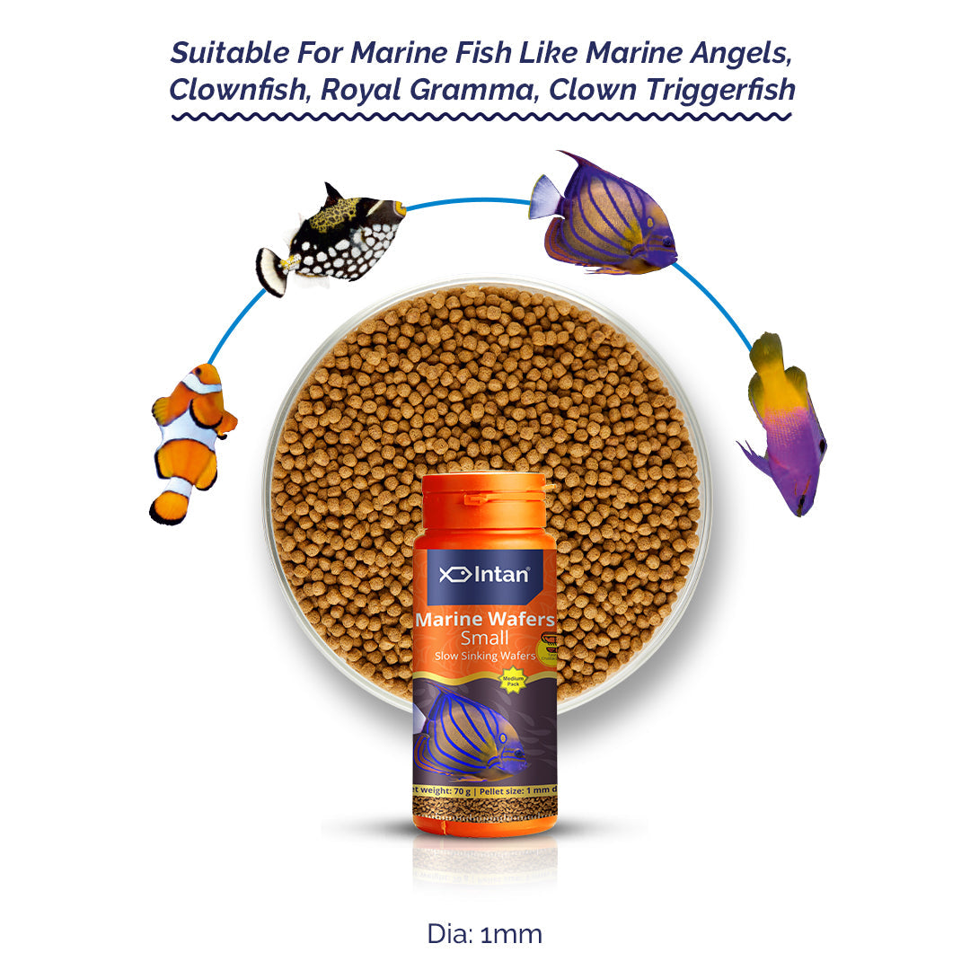 Intan Marine Wafers (Small Slowly Sinking Wafers), a Highly Nutritious Ornamental Fish Food with 38% protein, are expertly designed for Marine fish such as Marine Angels, Clownfish, Royal Gramma & Clown Trigger. Created to replicate the nutrition found in the natural habitat of Marine fishes, this special formulation boasts high acceptance among marine species. It ensures balanced nutrition, colour enhancement, & strengthened immunity in Marine fishes. The high protein content, sourced from sustainable crustaceans, promotes vitality & excellent growth.