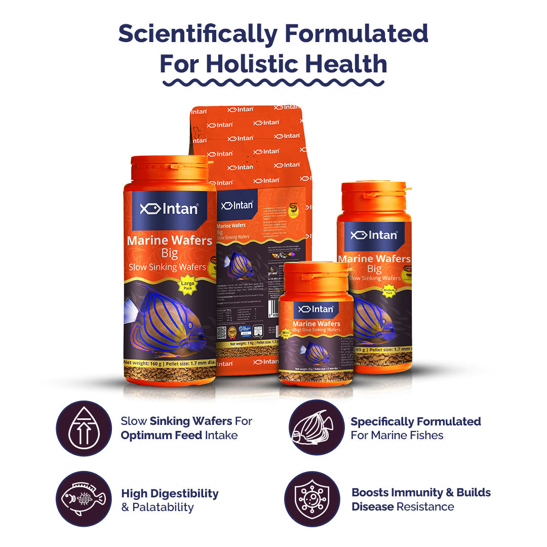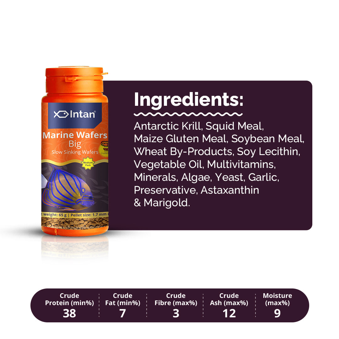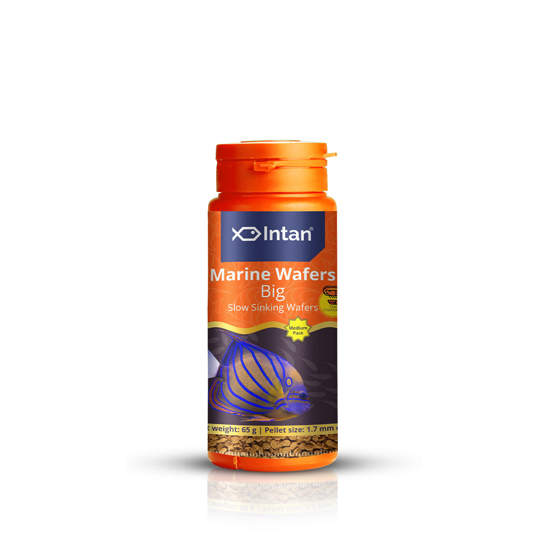 Intan Marine Wafers (Big Slowly Sinking Wafers), a Highly Nutritious Ornamental Fish Food with 38% protein, are expertly designed for Marine fish such as Marine Angels, Clownfish, Royal Gramma & Clown Trigger. Created to replicate the nutrition found in the natural habitat of Marine fishes, this special formulation boasts high acceptance among marine species. It ensures balanced nutrition, colour enhancement, & strengthened immunity in Marine fishes. The high protein content, sourced from sustainable crustaceans, promotes vitality & excellent growth.