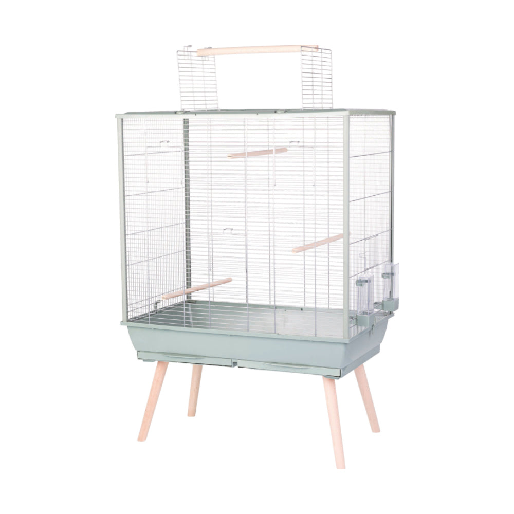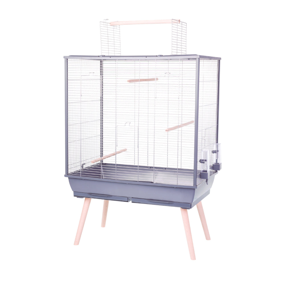 - Equipment: 4 wooden perches (3 inside the cage and 1 on the roof), 2 large feeders/drinkers, 1 top opening and 3 side openings