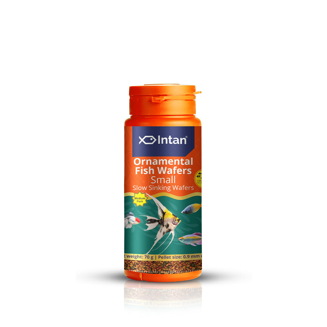 Intan Ornamental Fish Wafers (Small Slowly Sinking Wafers), a Highly Nutritious Ornamental Fish Food with 39% protein, are scientifically formulated to meet the optimum nutritional requirements of a diverse community of Ornamental Fish, including Angels, Gouramis, Goldfish, Barbs, and Rainbows. This balanced diet is crafted with high-quality Antarctic krill, algae, minerals, & vegetables such as spinach & green peas, providing essential amino acids for healthy growth & strength.
