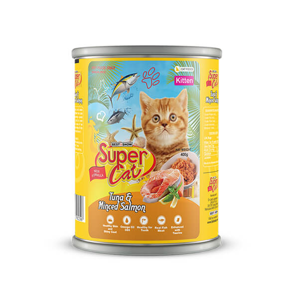Support your kitten’s healthy growth with the power of the ocean! Super Cat Tuna & Minced Salmon for Kitten is a nutrient-rich 400g wet food specially formulated to fuel development during the most critical stage of your cat’s life.