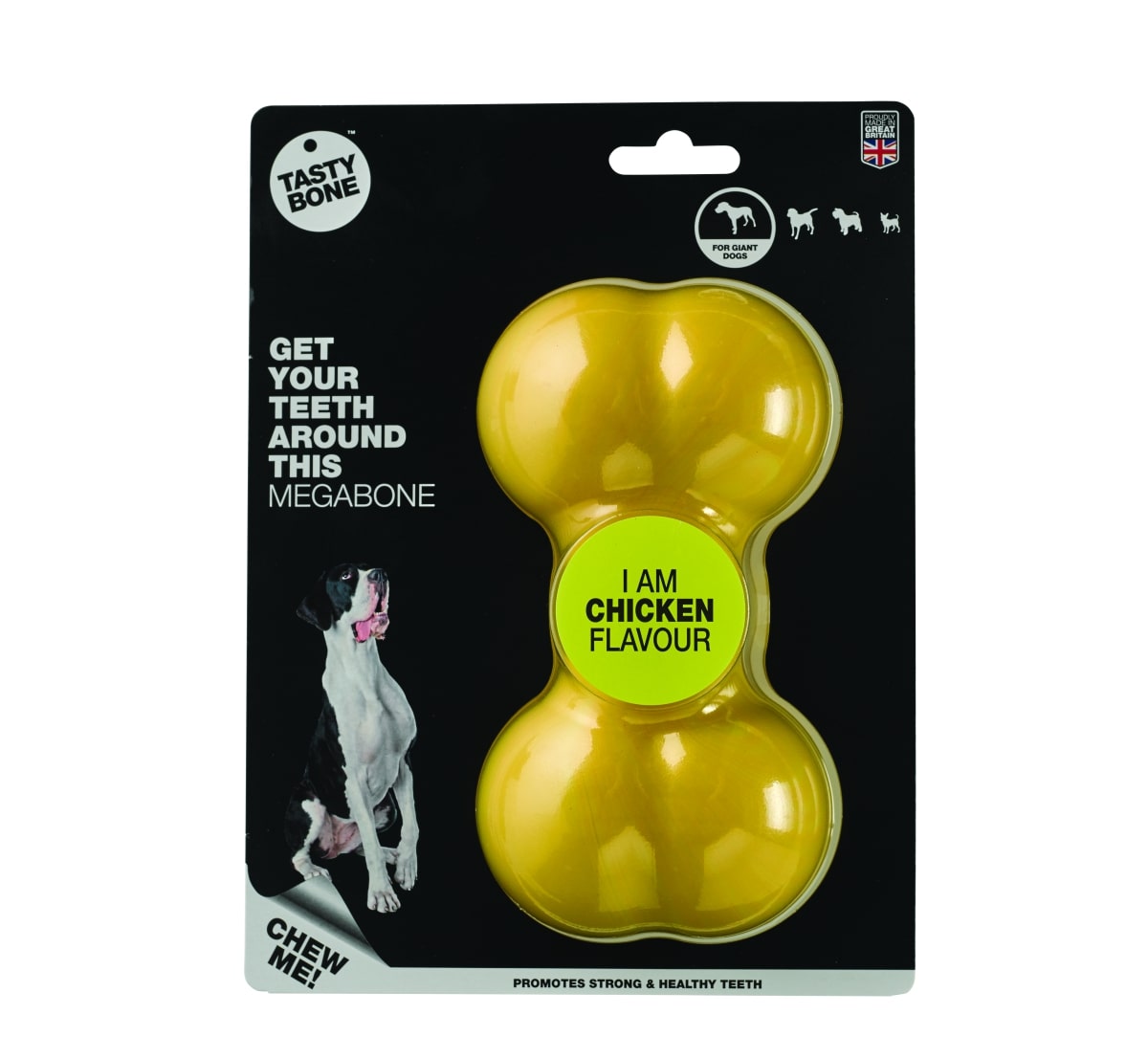 Our Super Tough range is made from 100% virgin nylon; guaranteed to last. Like all of our nylon chews, this TastyBone product has been tested on the most vigorous of chewers. Uniquely infused with irresistible flavours right through to the core, your dog will never get bored, as the flavour will last for the lifetime of the bone. With every bite your dog's gums and teeth become stronger and healthier, protecting against infections, tooth loss and vets fees. This bone has a lip-smackingly delicious Chicken flavour and is designed for toy, small, medium, large and giant dogs.