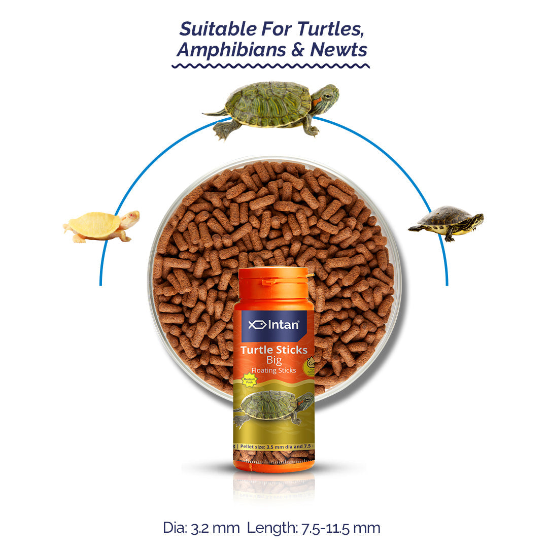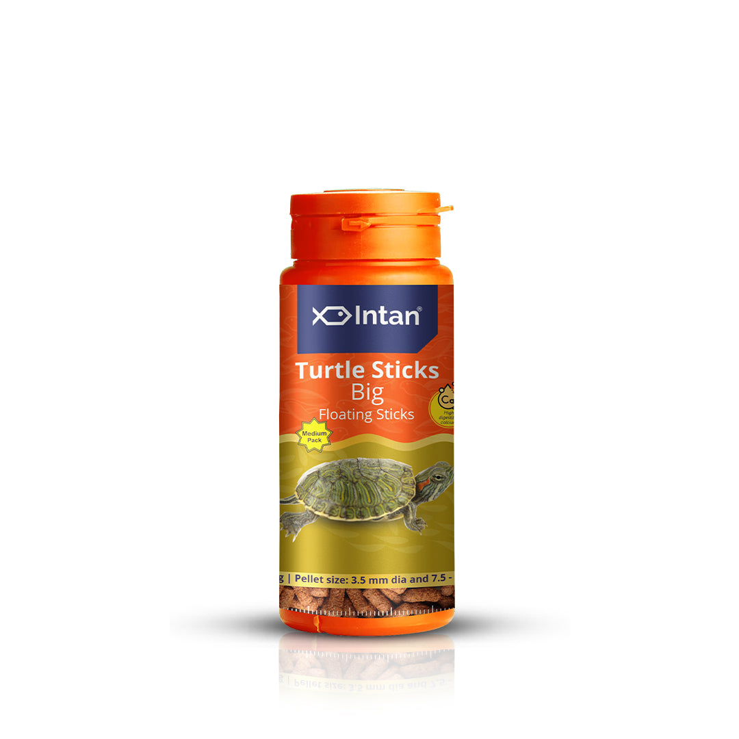 Intan Turtle Sticks (Big Floating Sticks), a Highly Nutritious Ornamental Fish Food with 38% protein. Scientifically balanced & specially designed for Turtles, Amphibians & Newts. These sticks contain excellent digestible calcium which ensures strong & sturdy shell development. The carefully formulated diet enriched with fresh vegetables is loaded with Vitamin A guaranteeing wholesome nutrition & vitality for your pets.