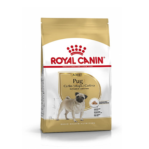 Suitable for dogs over 10 months old, ROYAL CANIN® Pug Adult is specially formulated with all the unique nutritional needs of your adult Pug in mind. Because the Pug’s skin is folded, and the folds can become warm and retain unwanted humidity, it’s important that your dog’s diet helps to support the health of its skin. ROYAL CANIN® Pug Adult’s exclusive formula helps to support the skin’s “barrier” role, as well as overall skin health. ROYAL CANIN® Pug Adult also contains a balance of nutrients that help to support your Pug’s muscle tone. Pugs have very specific features: a large head and a body with short, square muscles. Its jaws and very thick lips can make it difficult for it to pick up its food; Pugs also have a tendency to swallow their food without chewing it first. The kibble in ROYAL CANIN® Pug Adult is tailor-made exclusively for the Pug breed. The shape and size of the kibble is specifically designed to make it easier for your Pug to pick up. Its properties also encourage your dog to chew it before swallowing.