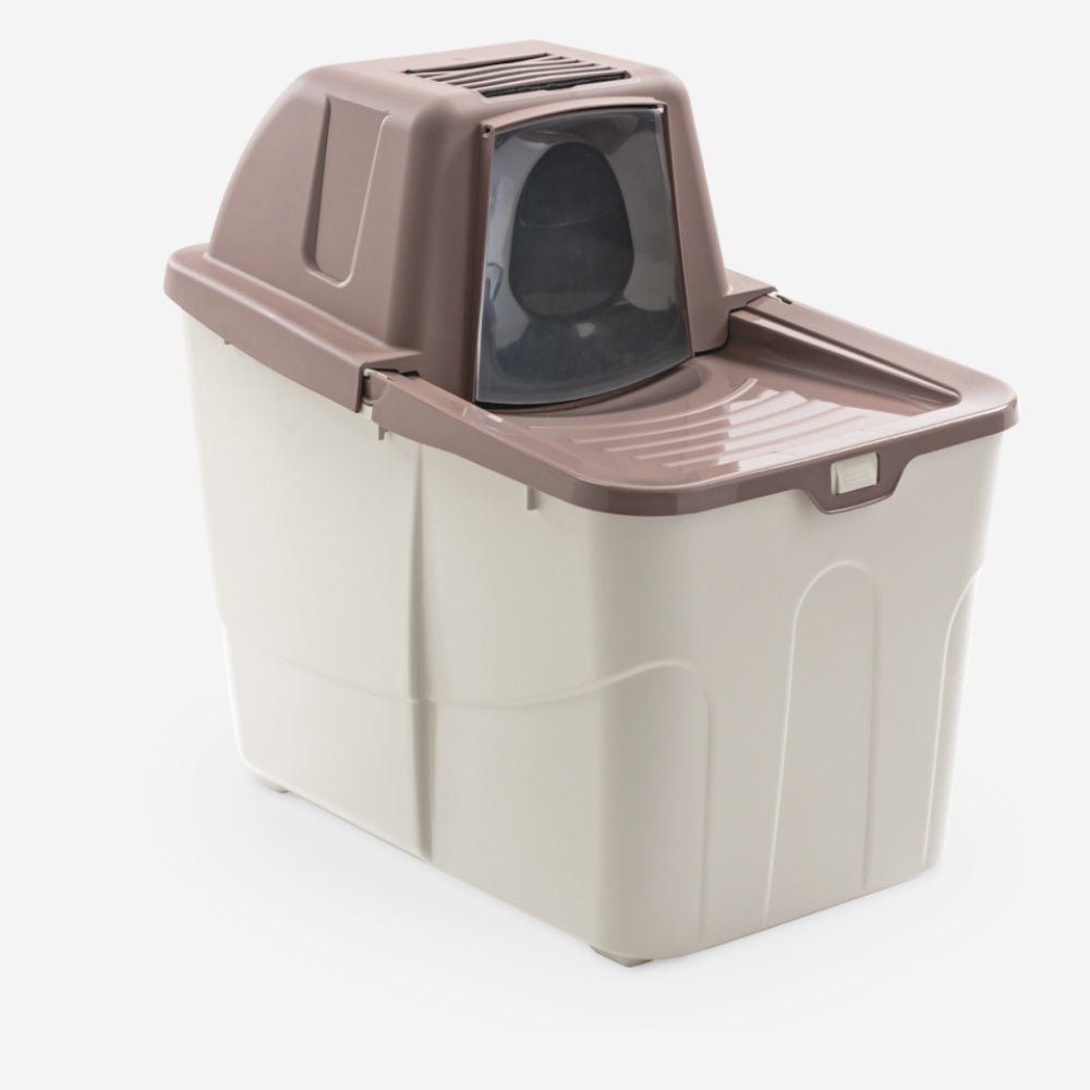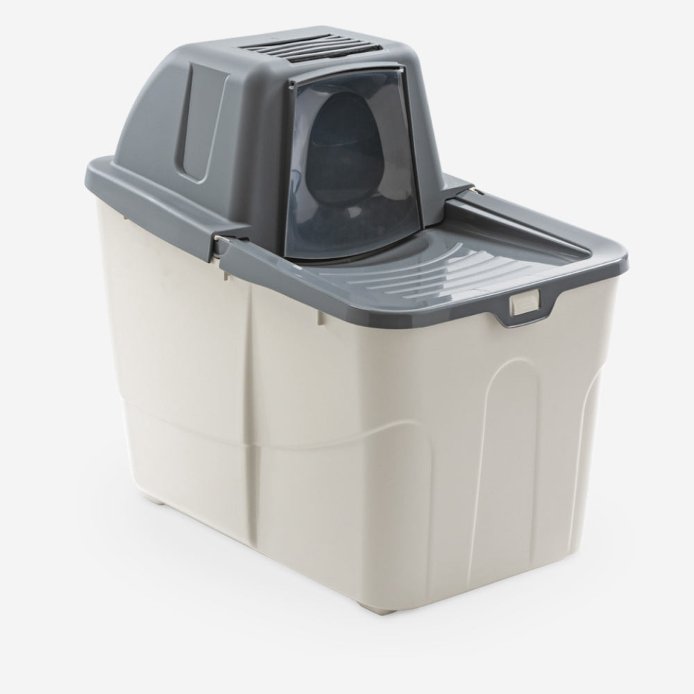 Closed toilet equipped with scoop and fully openable lid which guarantees complete and easy cleaning.
