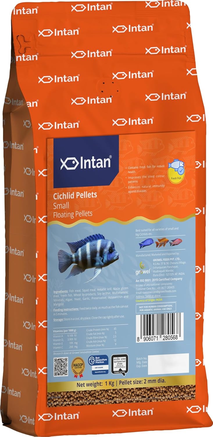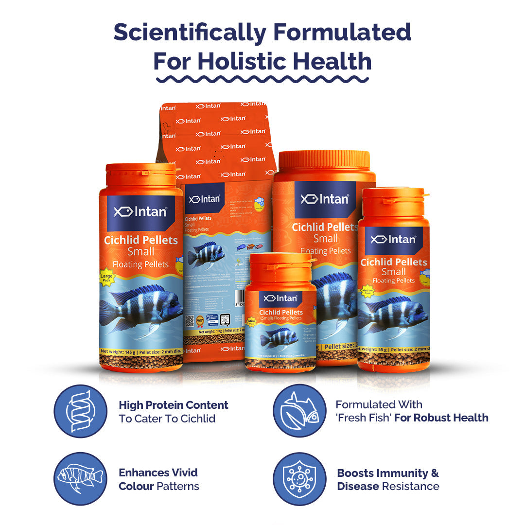 Intan Cichlid Pellets (Small Floating Pellets), a Highly Nutritious Ornamental Fish Food with 45% protein, are formulated to provide a high-protein, balanced diet for all types of small & big Cichlids. These pellets include fresh fish & Antarctic krill to enhance flavour & palatability. Natural Astaxanthin derived from krill helps to highlight the unique colour patterns of a variety of fish. Additionally, natural ingredients like marigolds, garlic, & algae not only enhance colour patterns but also strengthen the immune system.