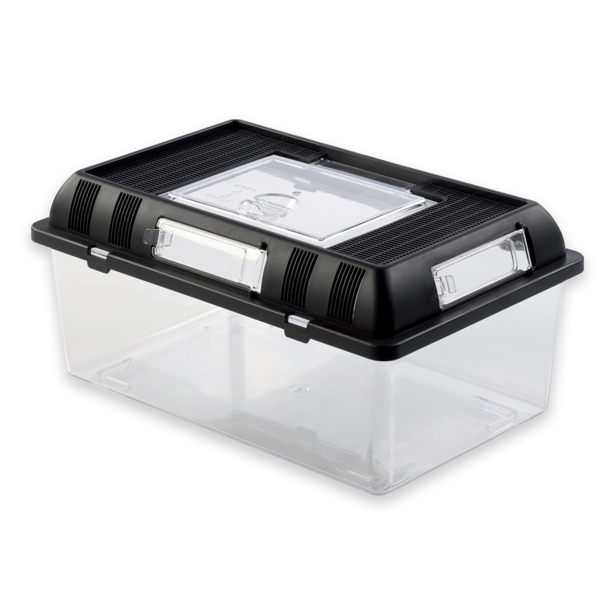 Transparent plastic terrarium. Ideal for transporting animals or live food. Stack-able for breeding or displaying reptiles. Ventilation slots at both sides. Large access door with lid.