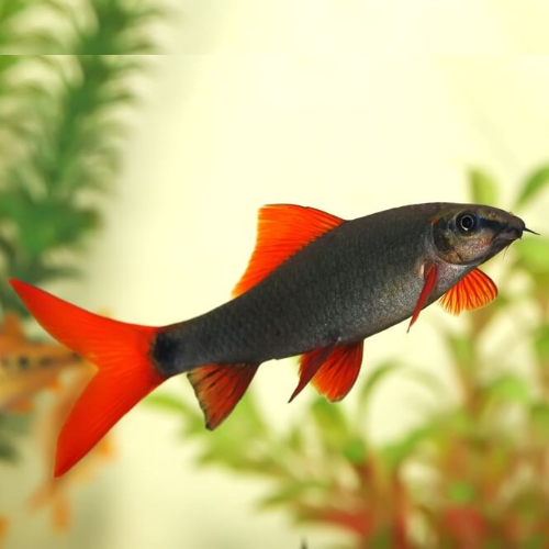 Color: Typically dark gray to black with bright red or orange fins. Some morphs (e.g., albino rainbow shark) have pale or white bodies with red/orange fins.