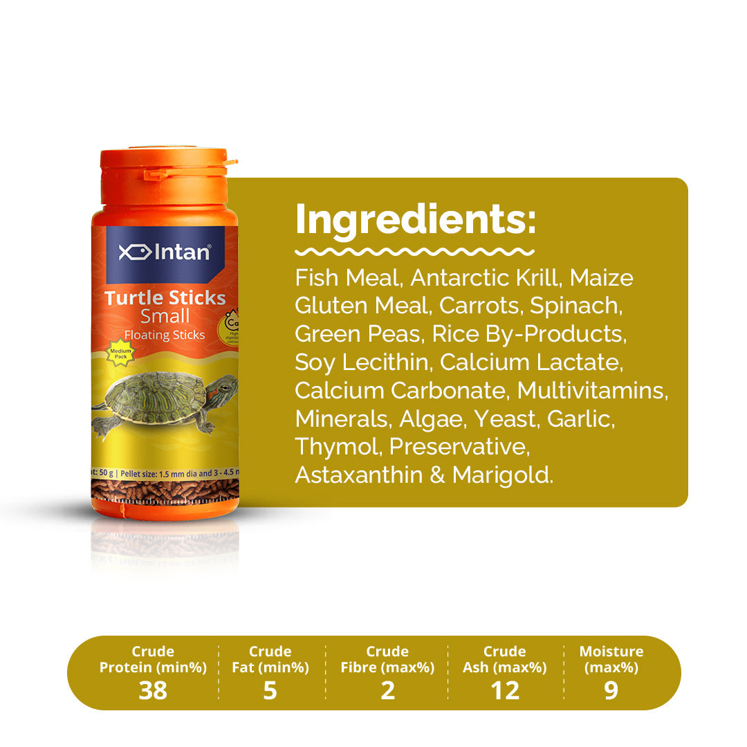 Intan Turtle Sticks (Small Floating Sticks), a Highly Nutritious Ornamental Fish Food with 38% protein. Scientifically balanced & specially designed for Turtles, Amphibians & Newts. These sticks contain excellent digestible calcium which ensures strong & sturdy shell development. The carefully formulated diet enriched with fresh vegetables is loaded with Vitamin A guaranteeing wholesome nutrition & vitality for your pets.